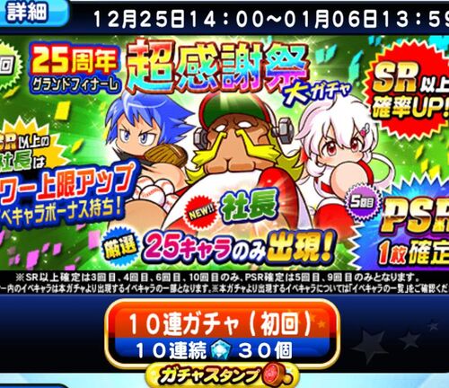 こんばんは、無課金パワプラーありさじ(@ArimuraSaji)です。 今回は25周年グランドフィナーレ超感謝祭ガチャを引くべきかについて考えていこうと思います。 基本情報 ・開催期間2019年12月25日14時から2020年1月6日13時59分まで ・厳選25キャラのみ出現(おや…