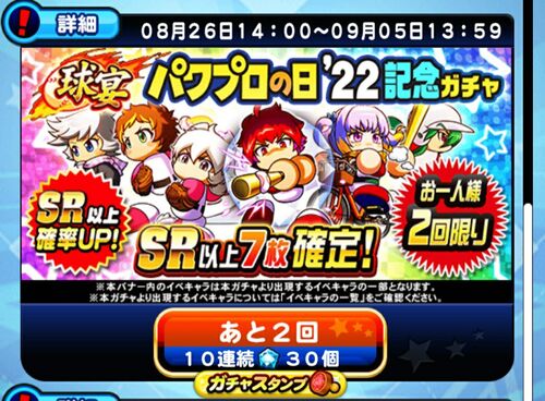 こんばんは、無課金パワプラーありさじ(@ArimuraSaji)です。 今回は球宴パワプロの日'22記念ガチャを引くべきかについて考えていこうと思います。 基本情報 ・開催期間8月26日14時から9月5日13時59分まで ・お一人様2回まで ・パワストーン30個 ・SR以上7枚…