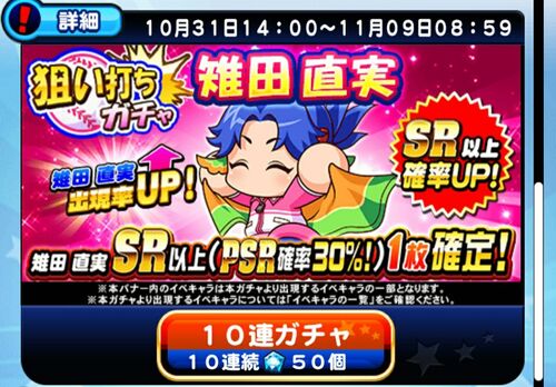 こんばんは、無課金パワプラーありさじ(@ArimuraSaji)です。 今回は狙い打ちガチャ雉田直美を引くべきかについて考えていこうと思います。 基本情報 ・開催期間2022年10月31日から11月9日まで ・雉田直美の出現率アップ(SR以上23.24%、PR16.07%、R18.21%) ・…