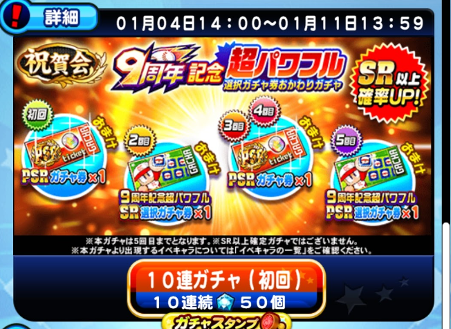 このガチャでは2回目に9周年記念超パワフルSR選択ガチャ券、5回目に9周年記念超パワフルPSR選択ガチャ券がおまけでついてくるようです。